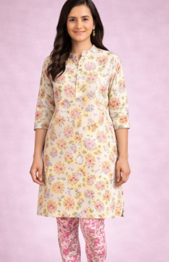 | Rayon kurta with printed patterns and solid leggings. | Pink | Rayon |