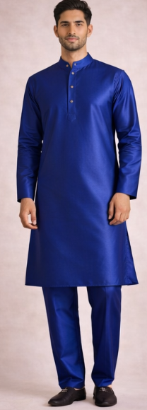 | Premium silk kurta pajama set with smooth sheen and classic festive look. | Royal Blue | Pure Silk |