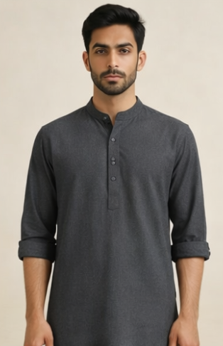 Soft-touch cotton kurta with a modern neckline and rolled sleeves. Charcoal Grey Cotton Slub
