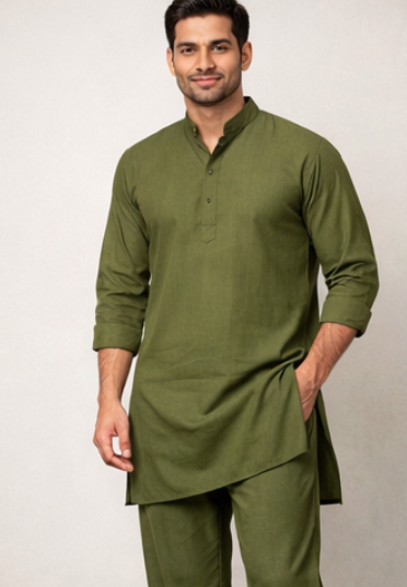 | Breathable cotton set ideal for warm climates, features side slits for comfort. | Olive Green | 100% Cotton |