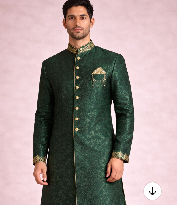 | Premium groom-style sherwani with rich woven patterns. | Deep Green | Pure Silk |