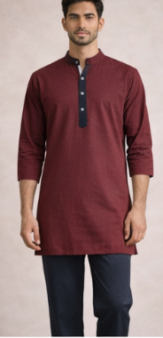 Modern ethnic shirt with contrast button placket. Wine Red Cotton