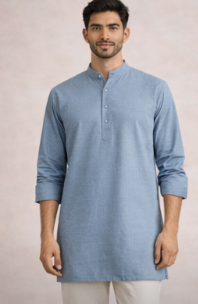 | Modern ethnic shirt with stitched placket and soft hand-feel. | Dusty Blue | Cotton Slub |