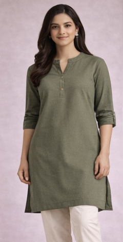Trendy kurta with rolled sleeves and soft feel. Olive Green Cotton Blend
